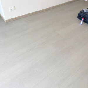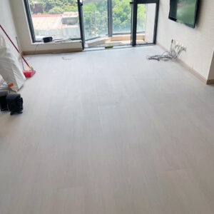 Quill Gray 採用同步壓紋(EIR)技術,呈現灰色洗舊木紋效果;產品具備 100% 防水 與 0.5mm 商用耐磨層,適合香港住宅、辦公室與零售空間,兼具耐用性與高級感。