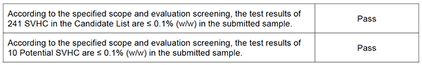 REACH (Test against 241 SVHC + 10 Potential SVHC) *SVHC stands for Substances of Very High Concern